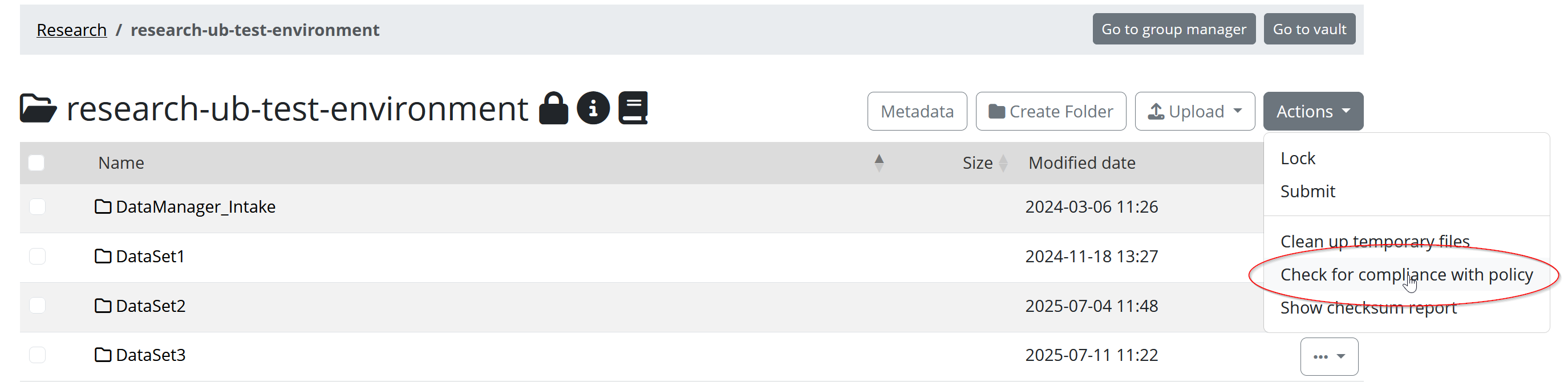 You can check in Yoda if you are in compliance with either the DANS Preferred formats or the 4TU Preferred formats by pressing the “Actions (Check for compliance with policy)” button.
