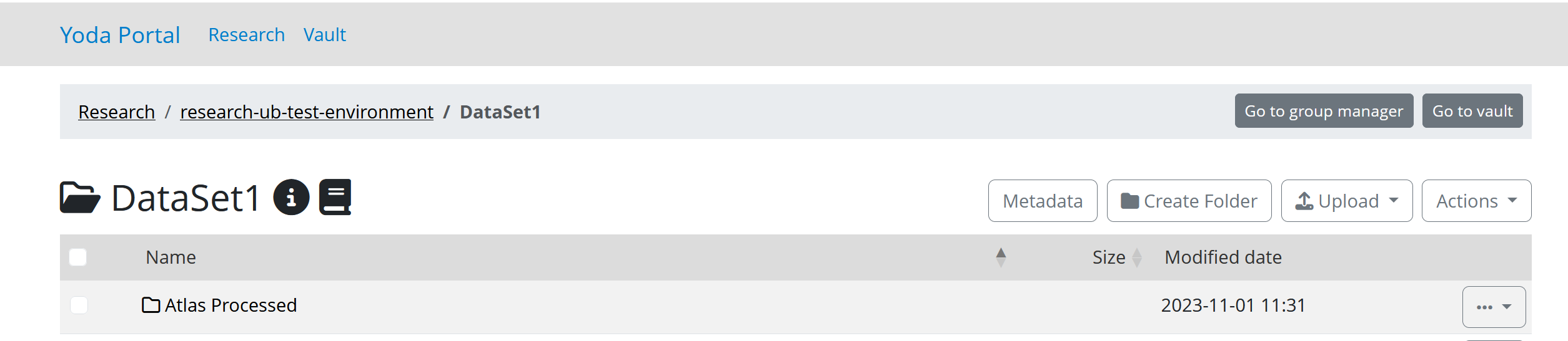 The vault of your group becomes visible in the Yoda portal once it contains at least one data package. It has the same name as the research folder, except it starts with vault- (e.g. research-ub-test-project will have a Vault folder called vault-ub-test-project) . Everyone with access to your group research folder also has read-only access to the vault of your group.